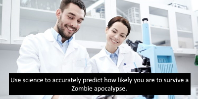 Our team of scientists, engineers and researchers have worked tirelessly to produce this scientifically accurate tool designed to tell you just how likely you are to survive a zombie apocalypse. Take our test now to show yourself and the rest of the world that you can survive a zombie apocalypse (or can't as the case may be).